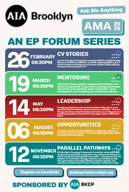 Program Structure: MAP brings together young architects, emerging professionals, and seasoned practitioners in small, intentional mentorship clusters. Each cohort is anchored by four in‑person touchpoints aligned with AIA Brooklyn’s BKEP Ask Me Anything Forums, creating a consistent rhythm of connection, reflection, and real‑world insight.
